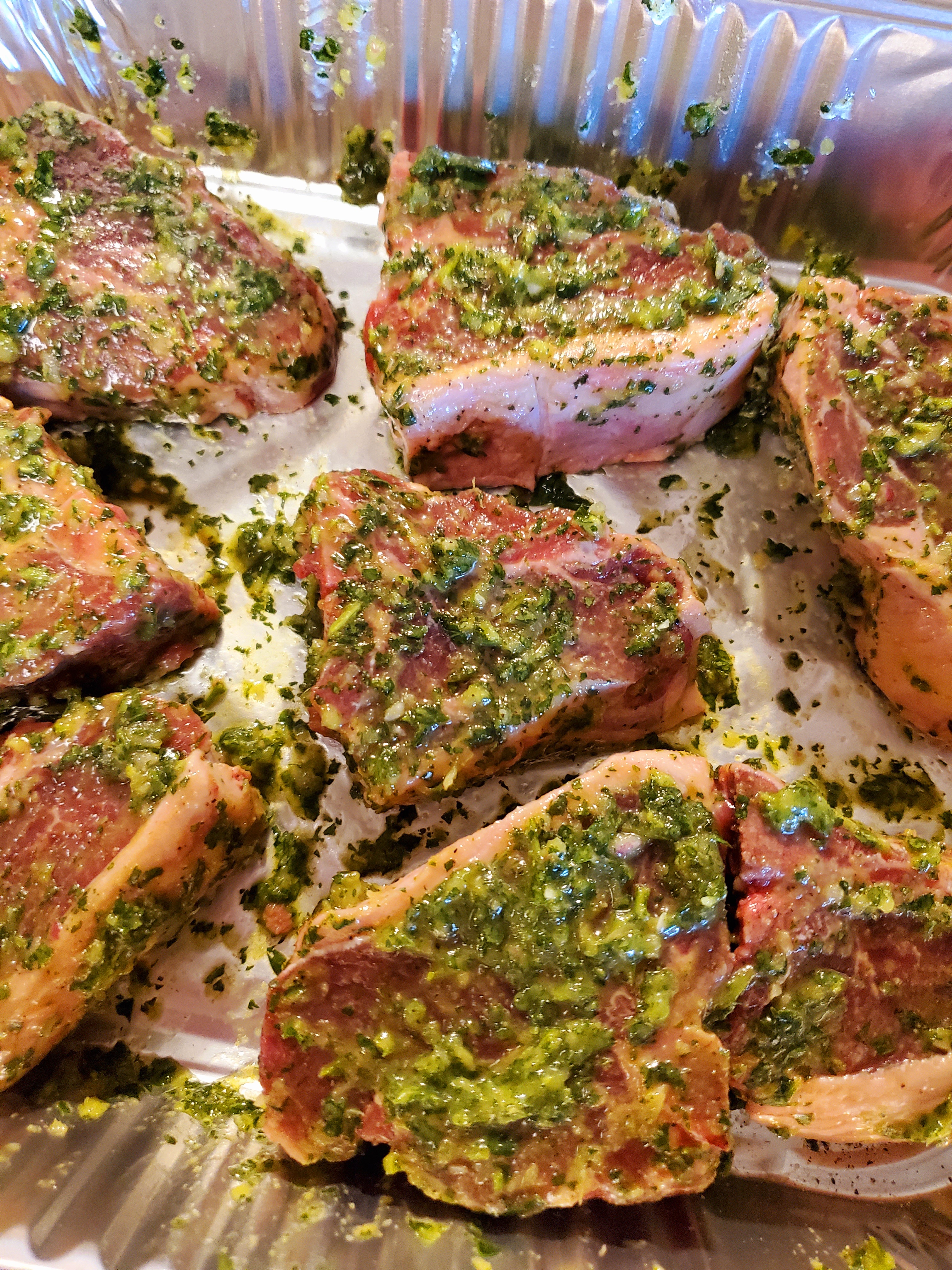 Add lamb chops with few tablespoons of the chimichurri to a bowl or disposable pan and coat well making sure all of the lamb is covered. The chops should marinate at least 4 hours but can marinate overnight.